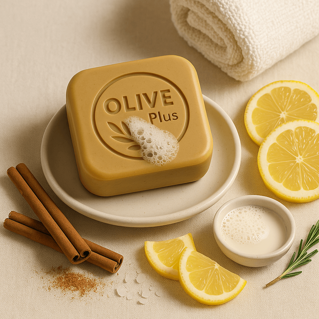 Revitalize your skin with the Olive Plus Cinnamon & Lemon Oil Soap Bar, a warm, refreshing blend made with virgin olive oil, natural cinnamon bark, and bright citrus lemon extract.